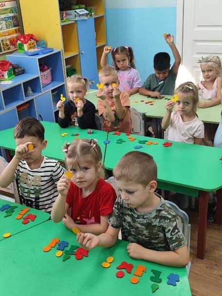 Занятие по формированию элементарных математических представлений в группе "Знайки". Ребята выполняли не сложные задания на счет, соотнести фигуры по форме и цвету с помощью фигурок животных и овощей.