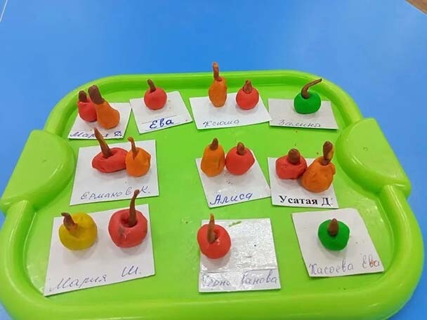 Цель: закреплять умение детей лепить шарики. Делать углубление, вытягивать пластилин в форму груши.